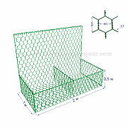 Сетка двойного кручения — согласно ГОСТ Р 51285, произведена из проволоки согласно ГОСТ 3282 с цинковым покрытием (не менее 250г/м2) согласно ГОСТ Р 50575, с размером шестиугольной ячейки 80×100 сетку двойного кручения для габионных сетчатых изделий согласно ГОСТ Р 52132, диаметр основной проволоки от 2,4 до 2,7 мм, диаметр проволоки кромки от 3 до 3,4 мм.